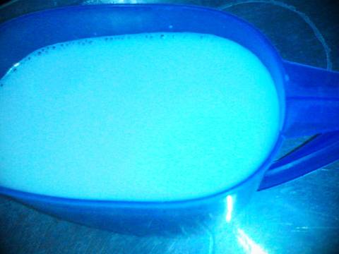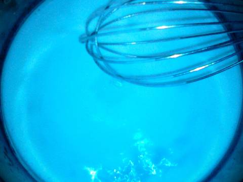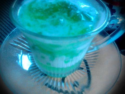 Nyalakan kompor,tuang santan kedalam panci,aduk terus supaya tidak pecah sambil masukkan pasta pandan dan gula pasir,aduk sampai gula larut,dan ketika santan mulai meluap langsung matikan kompor